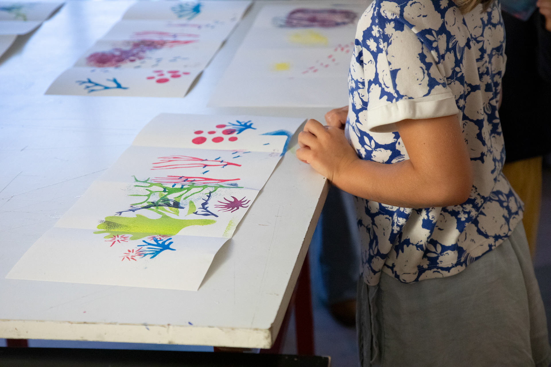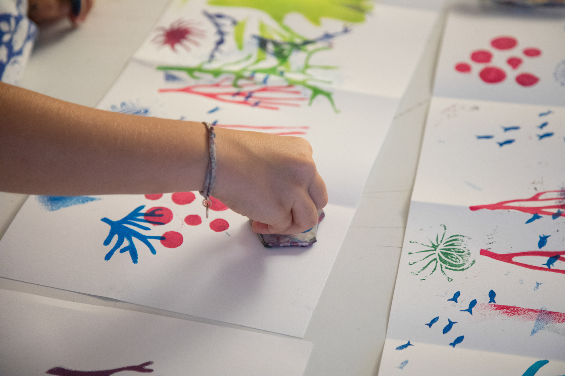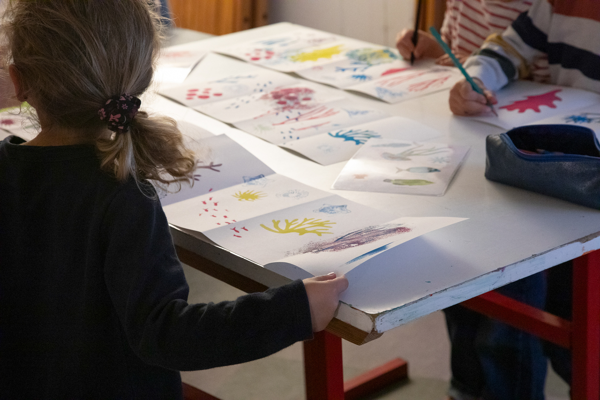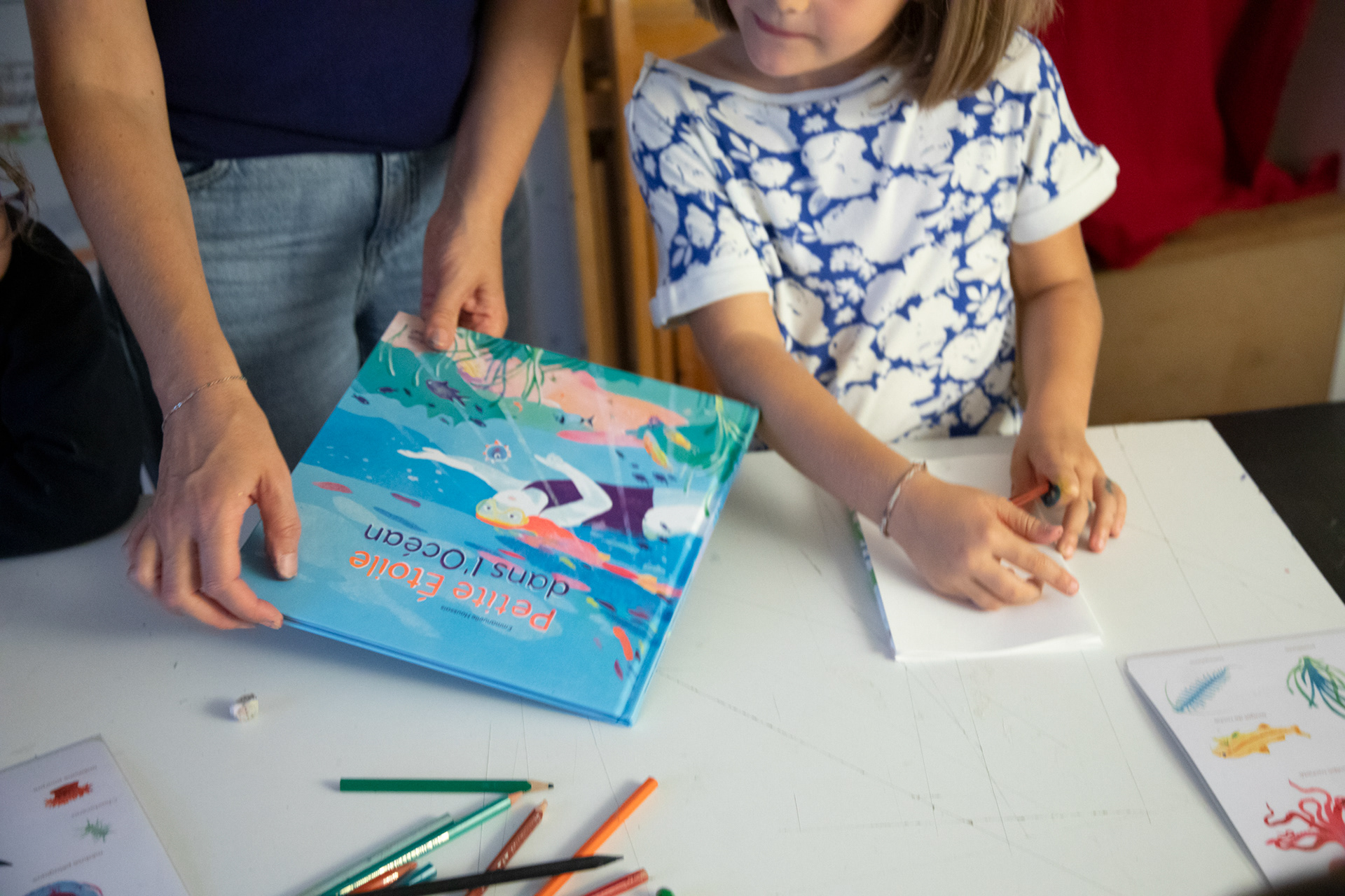Atelier d'illustration autour de l'album Petite Étoile dans l'Océan. Création d'un leporello illustré sur l'océan. Avec de la peinture, des pochoirs de coraux, de poissons, de gorgones et des tampons de créatures marines, crée ton paysage sous marin, puis, dessine-toi en petit plongeur. Imagine la couverture de ton livre et invente un titre !